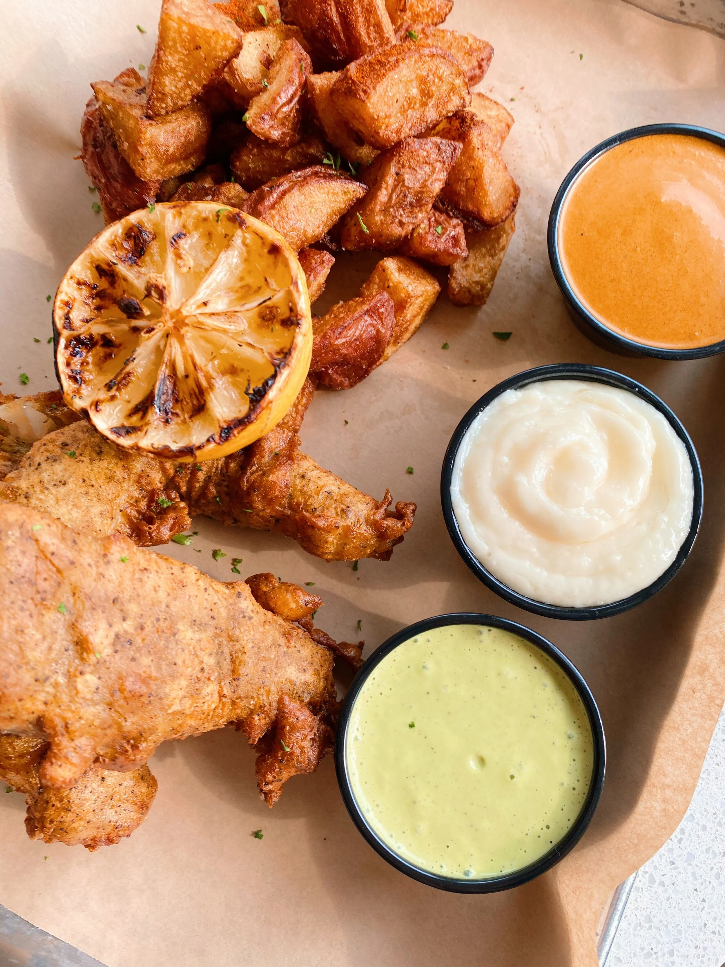 3 pcs of fresh, crispy cod fish tossed in a sumac seasoned batter, served with our signature potatoes seasoned with butter, paprika, garlic & lemon. Oh and the best part.. THREE house-made sauces: Creamy Dill, Spicy Tahini & Whipped Garlic.