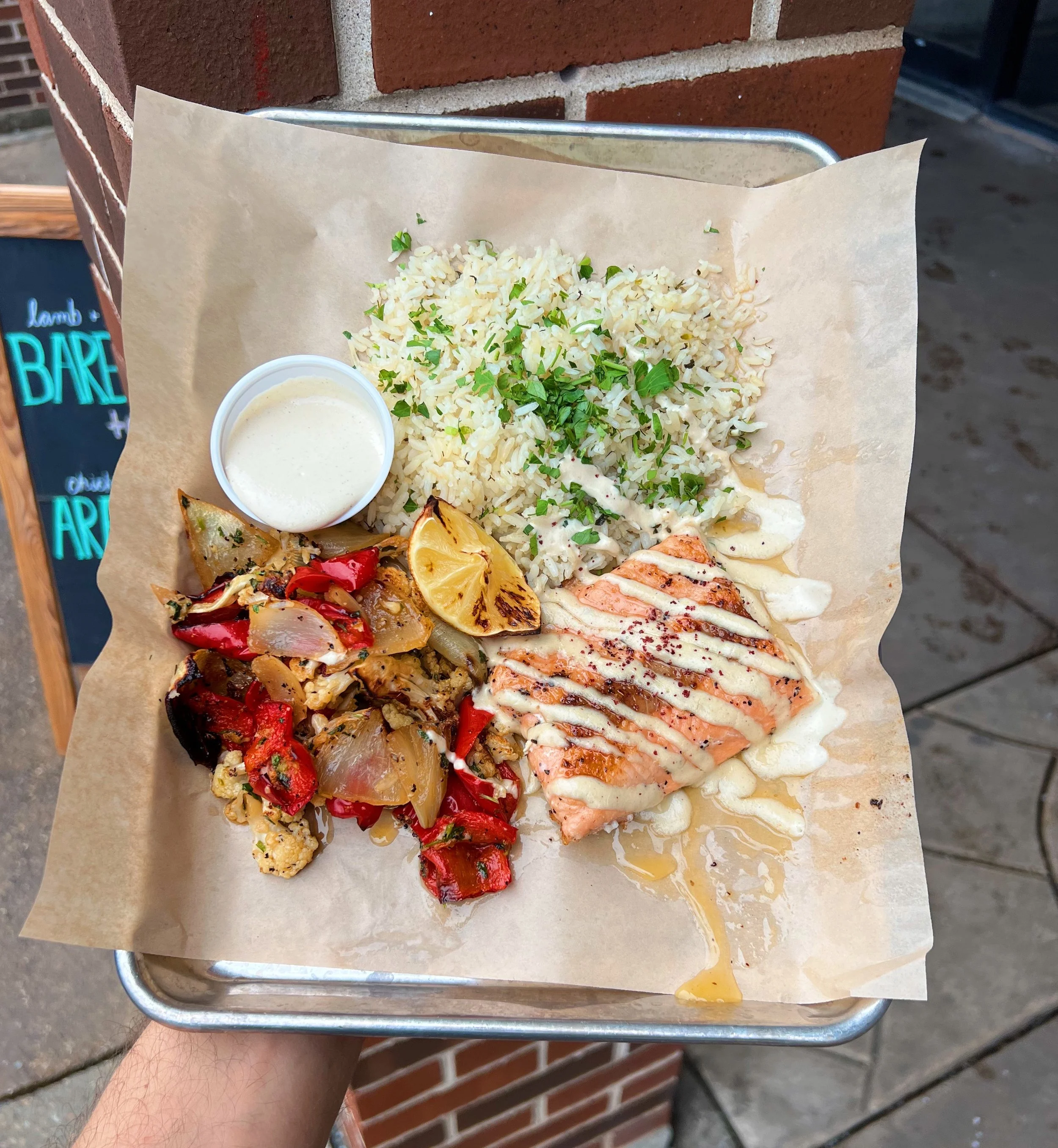 A 6 oz. Wild Caught Seared Salmon Filet, Glazed with a zesty Honey Butter Sauce, Home-made Tahini Drizzle, Fresh Herb Basmati Rice & Grilled Citrus Cauliflower Medley.